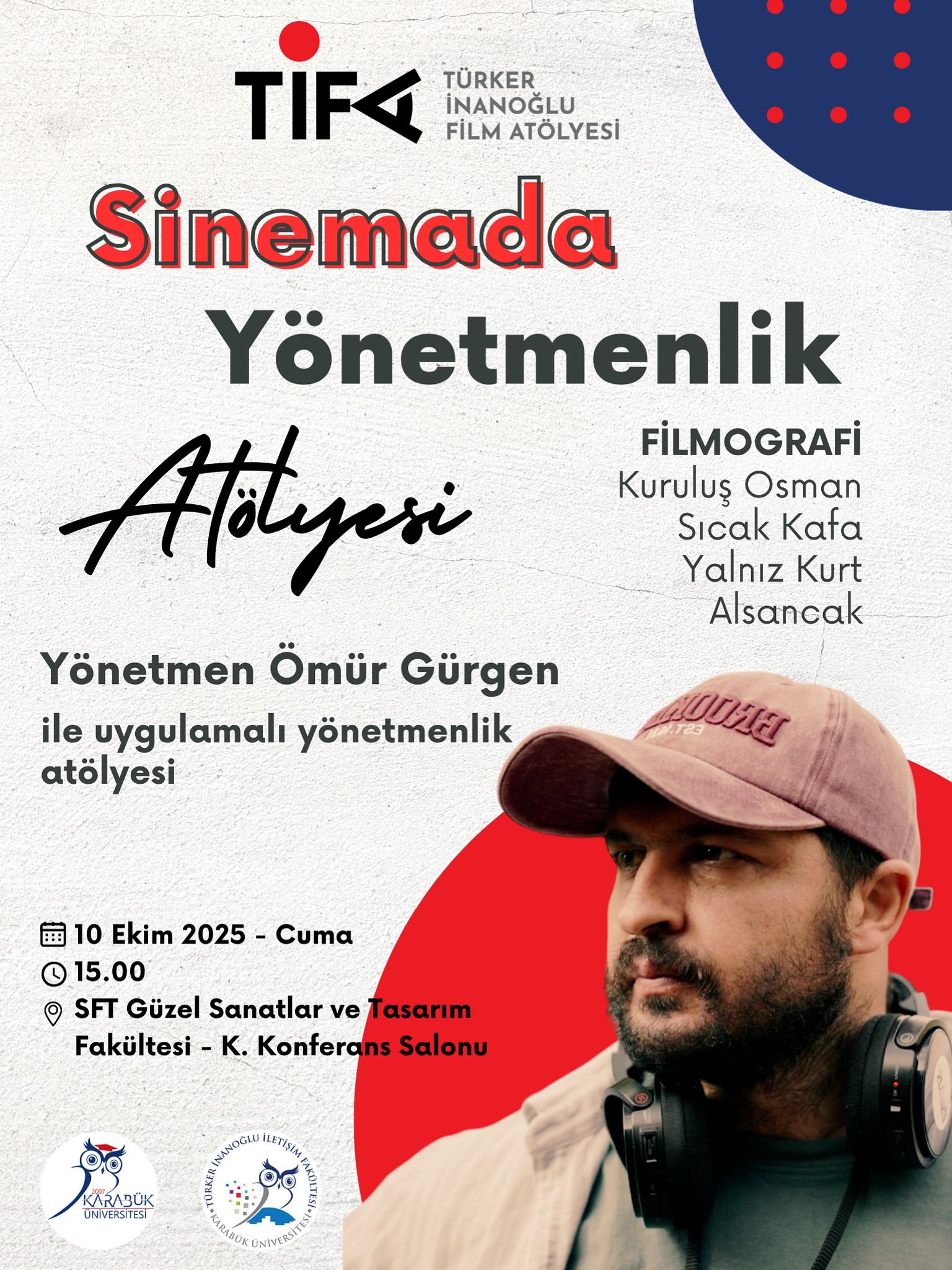 Sıcak Kafa, Kuruluş Osman gibi önemli yapımlarda görev alan ödüllü Yönetmen Ömür Gürgen öğrencilerimiz ile buluşuyor. Gürgen’in gerçekleştireceği, Türker İnanoğlu Film Atölyesi tarafından düzenlenen “Sinemada Yönetmenlik Atölyesi”ne tüm öğrencilerimiz ve öğretim üyelerimiz davetlidir.
