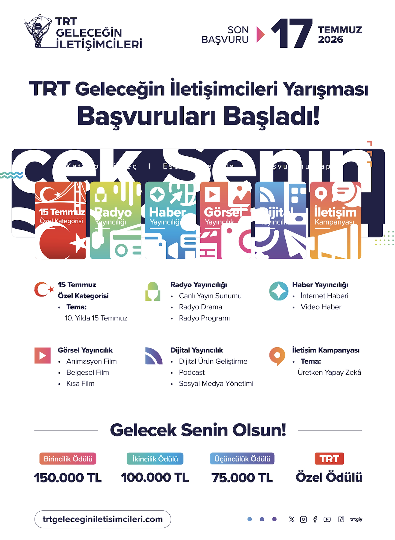 Ülkemizin en kapsamlı yarışmalarından olan TRT Geleceğin İletişimcileri Yarışması'nda mevcut kategorilere ek olarak bu yıla özel bir kategori eklenmiştir. 2026 yılında 10. yılı anılacak olan "15 Temmuz Demokrasi ve Millî Birlik Günü"nü demokrasi, millet iradesi, birlik ve beraberlik temalarıyla ele alacak yaratıcı ve yenilikçi eserleri kapsayan "10. Yılda 15 Temmuz" temalı 15 Temmuz Özel Kategorisinde gençlerin ürettiği özel içerikli "Belgesel Film", "Animasyon Film" ve "Video Haber" türlerindeki eserlerle başvuru yapılabilecektir.