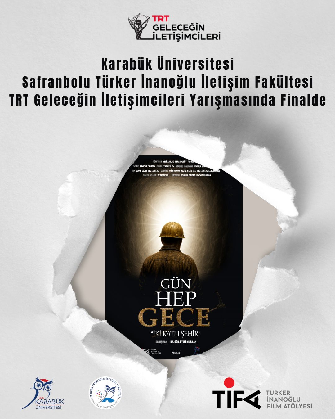 Radyo, Televizyon ve Sinema Bölümü öğrencileri tarafından hazırlanan “Gün Hep Gece” adlı belgesel film, ön değerlendirmeyi geçerek belgesel film kategorisinde finale kalmaya hak kazandı. Yaratıcı yaklaşımı ve güçlü anlatımıyla öne çıkan proje, yarışmanın dikkat çeken finalistleri arasında yer aldı.
