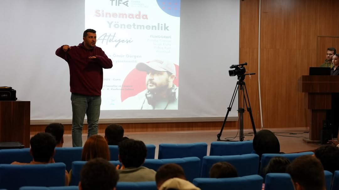 Sinemada Uygulamalı Yönetmenlik Atölyesi etkinliğinde Ömür Gürgen, sinema tutkusunu ve sektöre yönelik tecrübelerini paylaşarak uygulamalı bir eğitim gerçekleştirdi. Etkinliğe; Radyo, Televizyon ve Sinema Bölüm Başkanı ve TİFA Koordinatörü Doç. Dr. Burak Türten, öğretim üyeleri ve çok sayıda öğrenci katıldı.