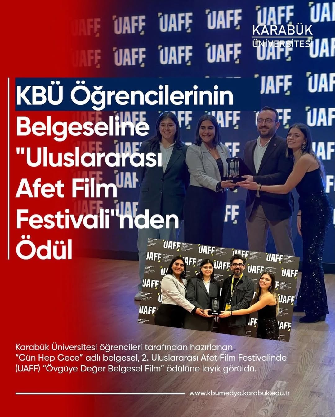 Karabük Üniversitesi öğrencileri tarafından hazırlanan “Gün Hep Gece” adlı belgesel, 2. Uluslararası Afet Film Festivalinde (UAFF) “Övgüye Değer Belgesel Film” ödülüne layık görüldü.